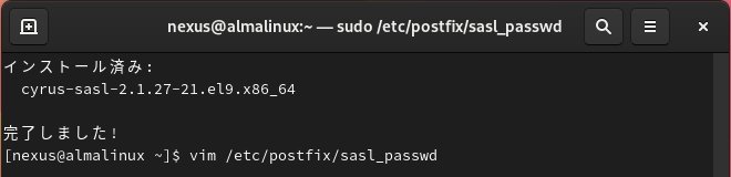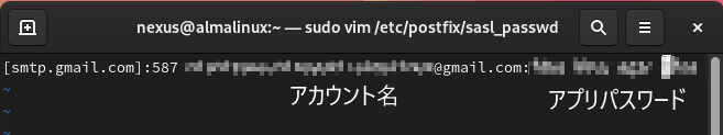 [smtp.gmail.com]:587 アカウント名@gmail.com:<アプリパスワード>
