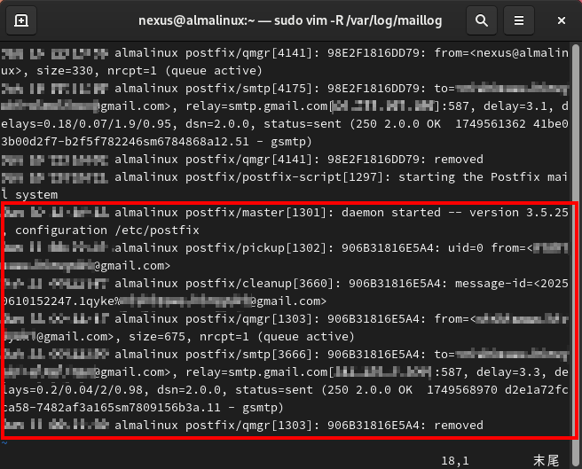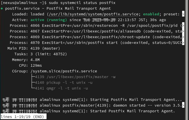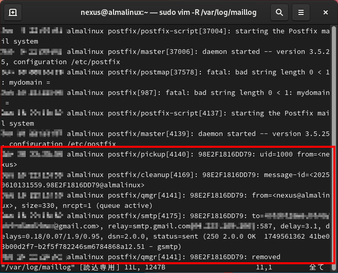 $ sudo vim /etc/postfix/main.cf#変更箇所のみ表示