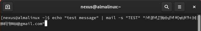 $ echo "testmessage" | mail -s "TEST" "メールアドレス=Gmail"