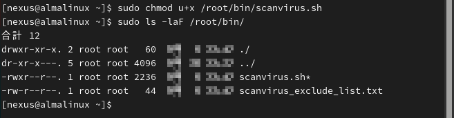 $ sudo chmod u+x /root/bin/scanvirus.sh