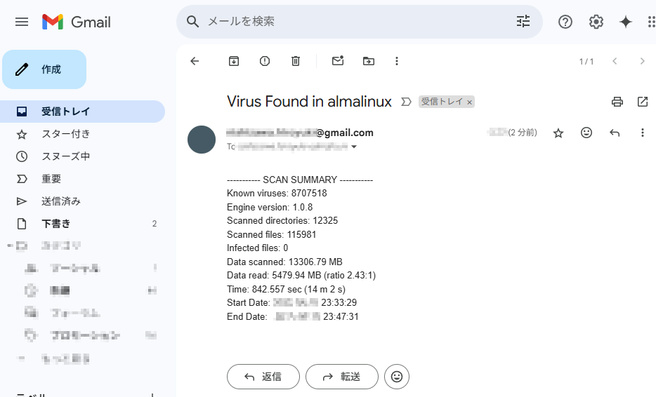 - ウイルス検知時の通知設定(Gmailに送信するよ)。