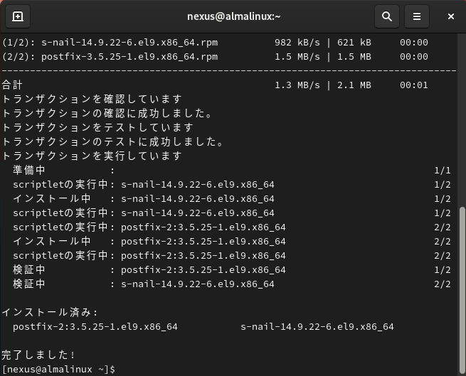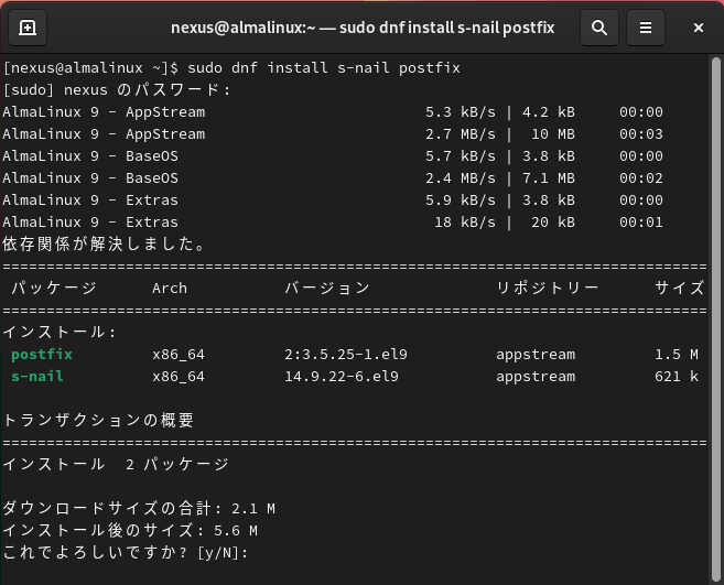 メールクライアントとメールサーバーの s-nail、 postfix をインストールします
