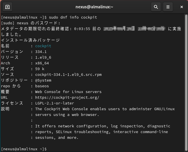 $ sudo dnf install cockpit※私の場合は、インストールされていましたので、インストール画像は省略します。