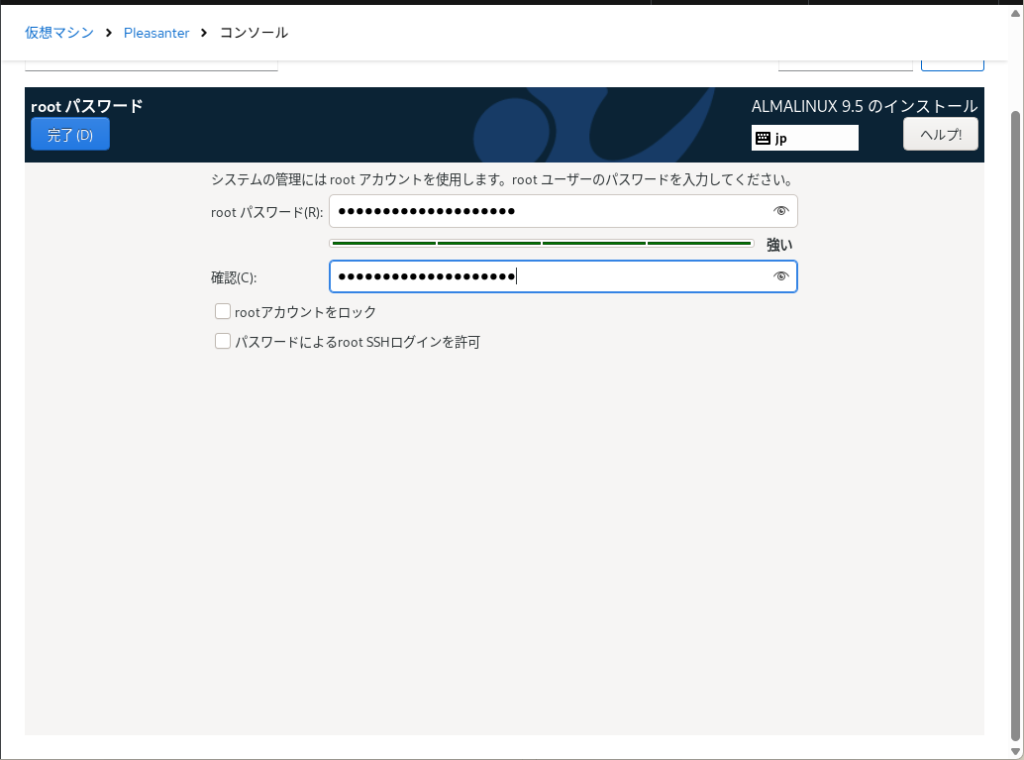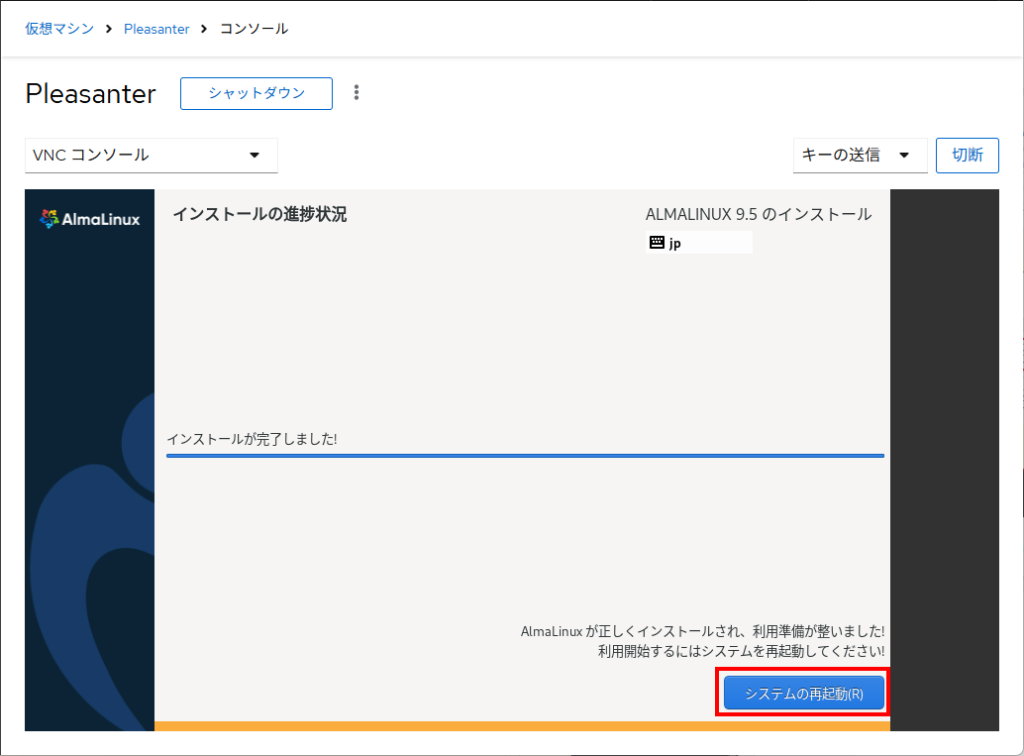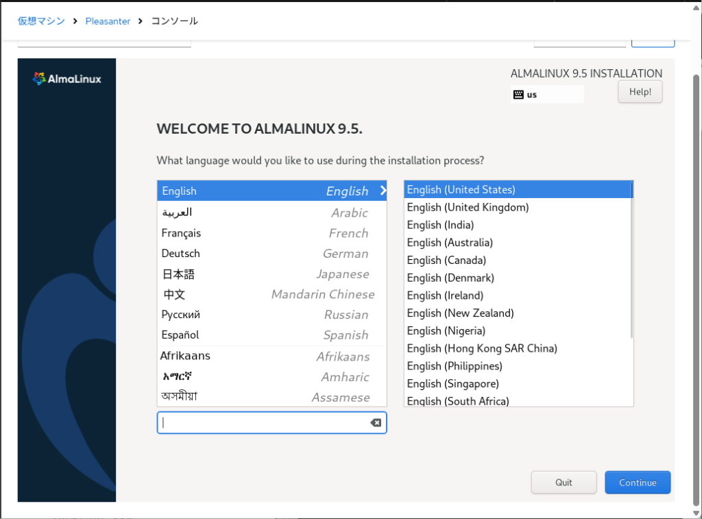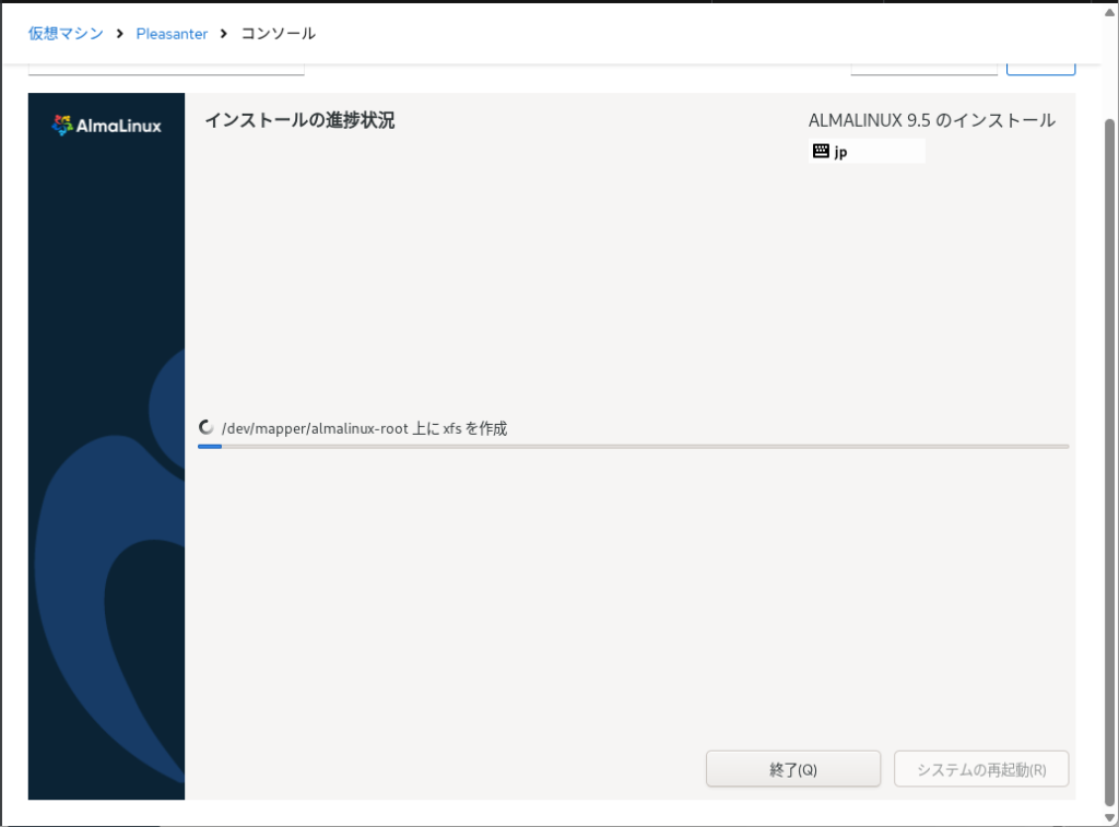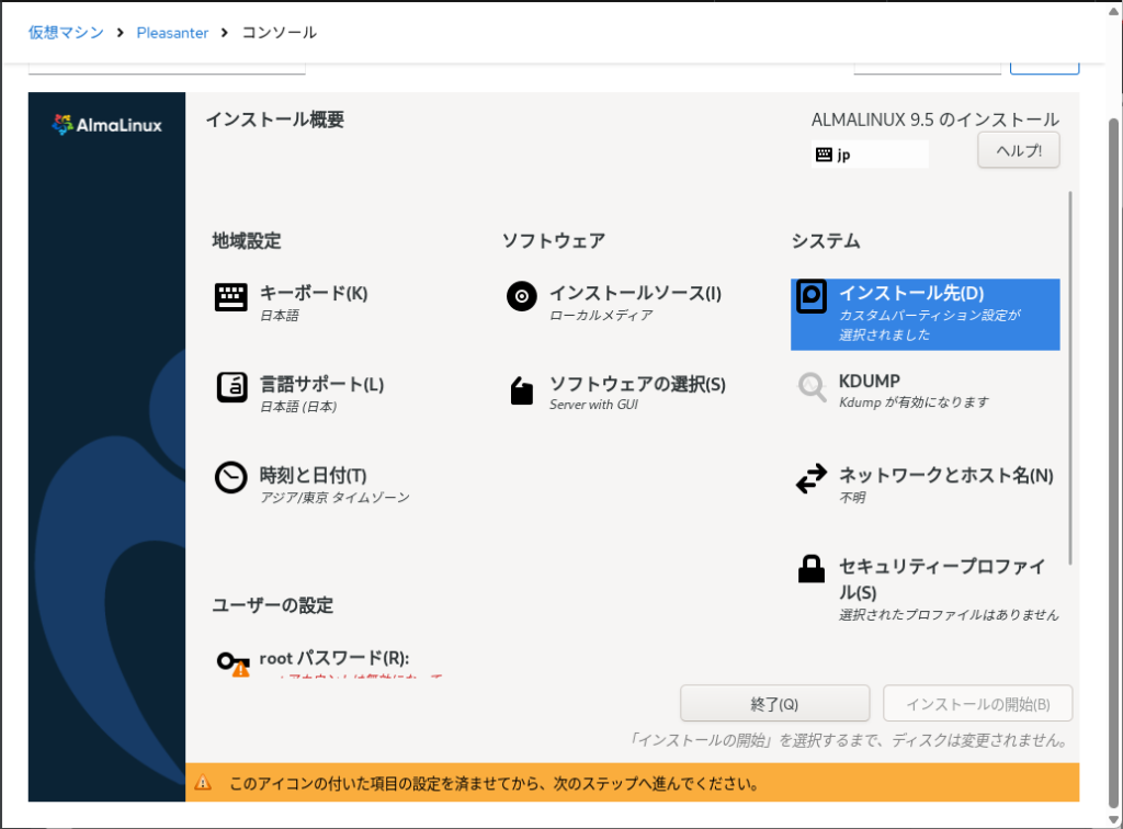 予めAlmaLinux の公式サイトから「AlmaLinux-9.5-x86_64-dvd.iso」をダウンロードしておいてください。
