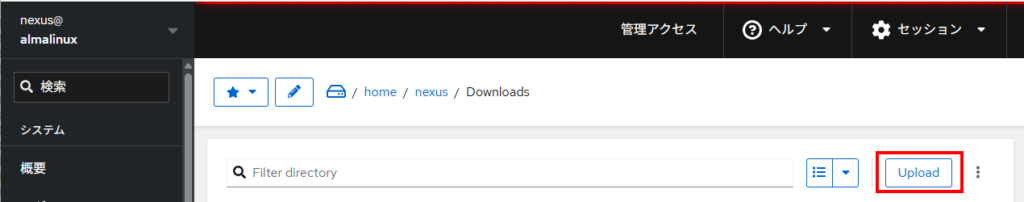 「Upload」をクリックし、予めダウンロードしておいた「AlmaLinux-9.5-x86_64-dvd.iso」を選択しアップロードします。