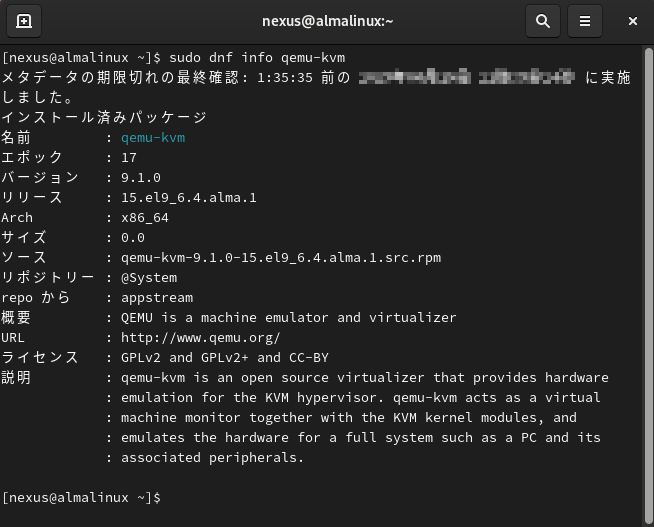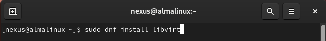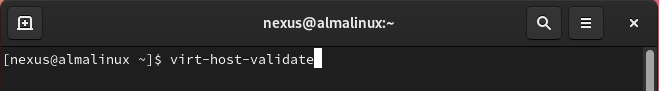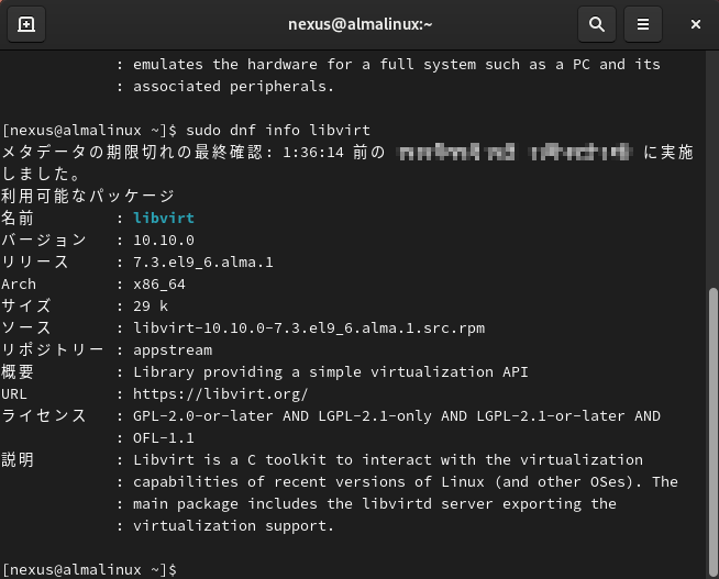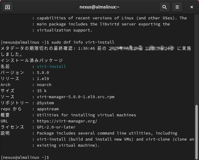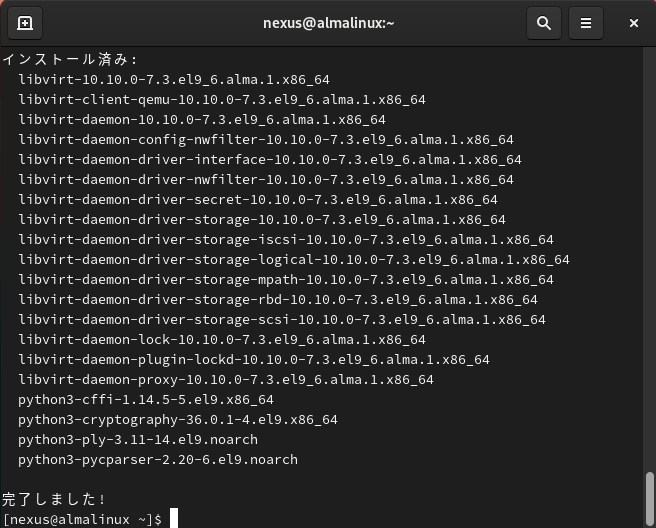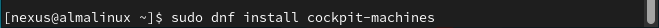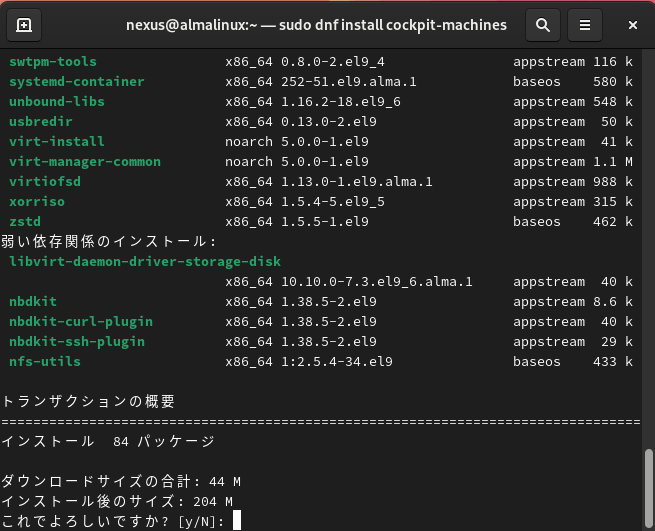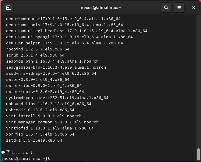 これからVMを作成しますが、CockPitからVMを作成する前に、AlmalinuxにVMを作成するためのツールが入っているか確認します。