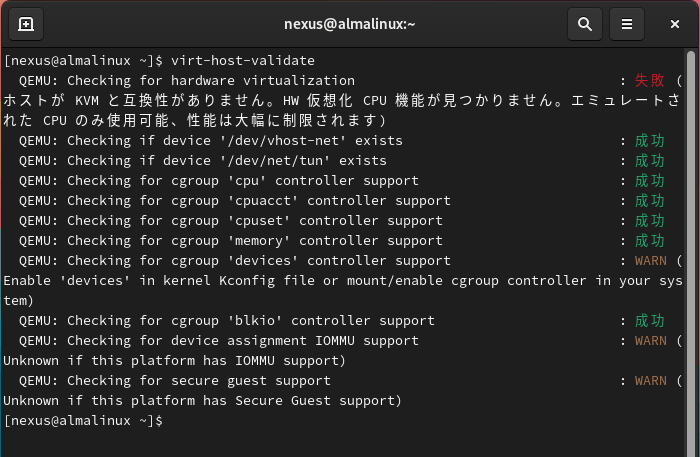 つぎに「WARN」です。3つあるうち「secure guest support」以外は、下記コマンドを実行することで、「成功」にできます。