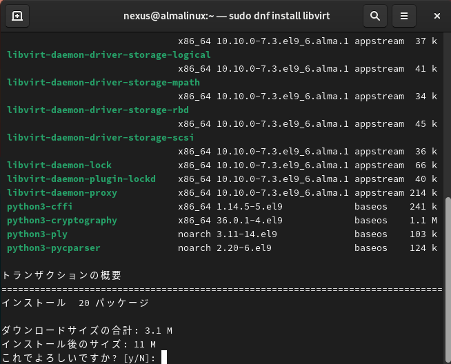 ※qemu-kvm、virt-installはインストール済みなので、インストール画像は省略します。