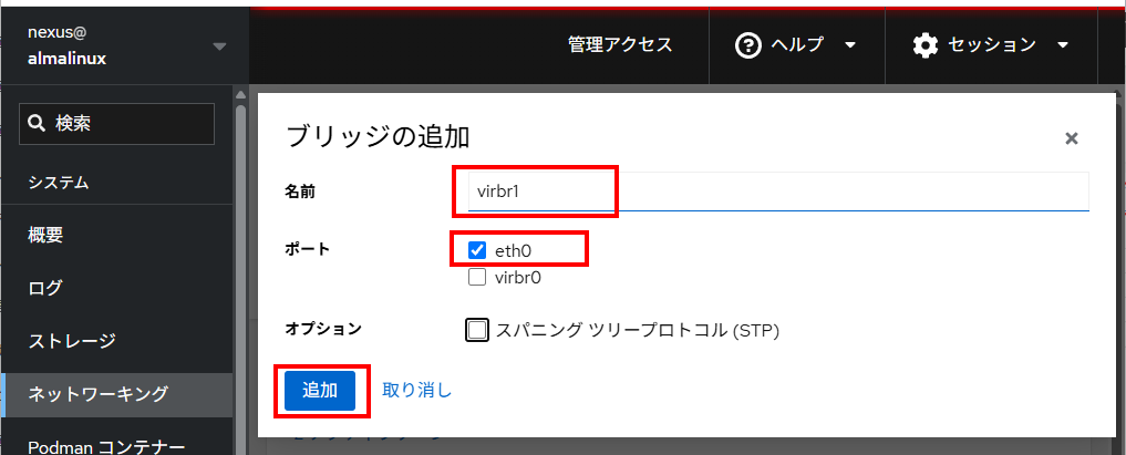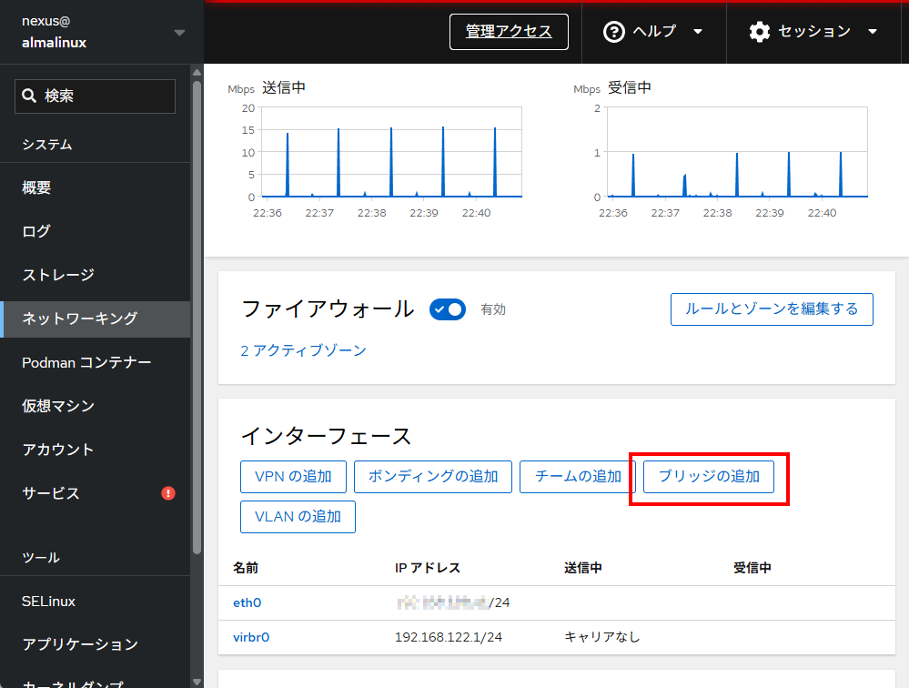 VMを作成する前に、ホストPC以外からもVMにアクセスできるようにブリッジを追加します。