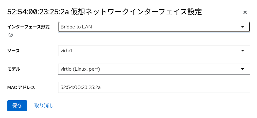 ソースが「ネットワーキング」にて追加した「virbr1」が設定されていることを確認。