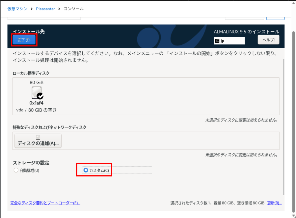 「ストレージの設定」を「カスタム」にし、「完了」をクリック。