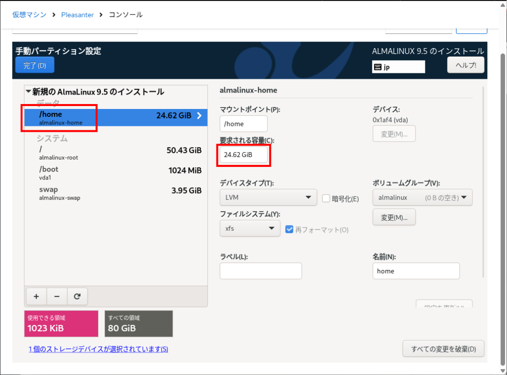 「/home」をクリック、「要求される容量」に「0GiB」を入力後、「swap」をクリック。