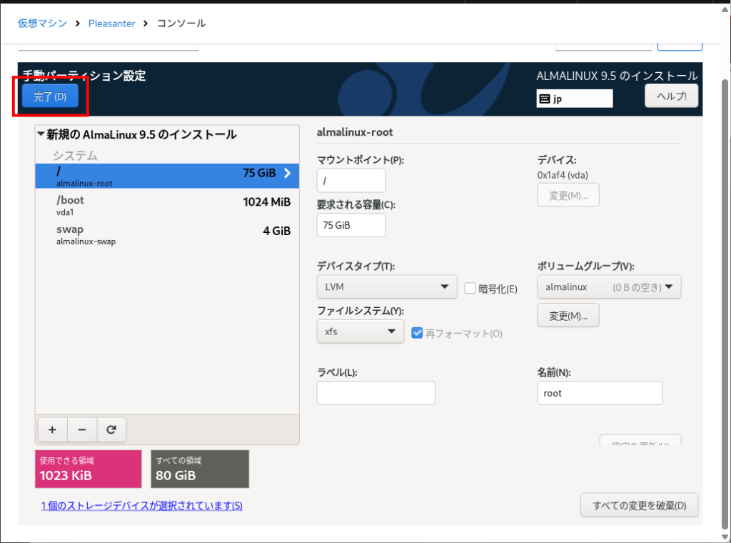 「/」(ルート)の「要求される容量」は「75GiB」を入力、「完了」をクリック。